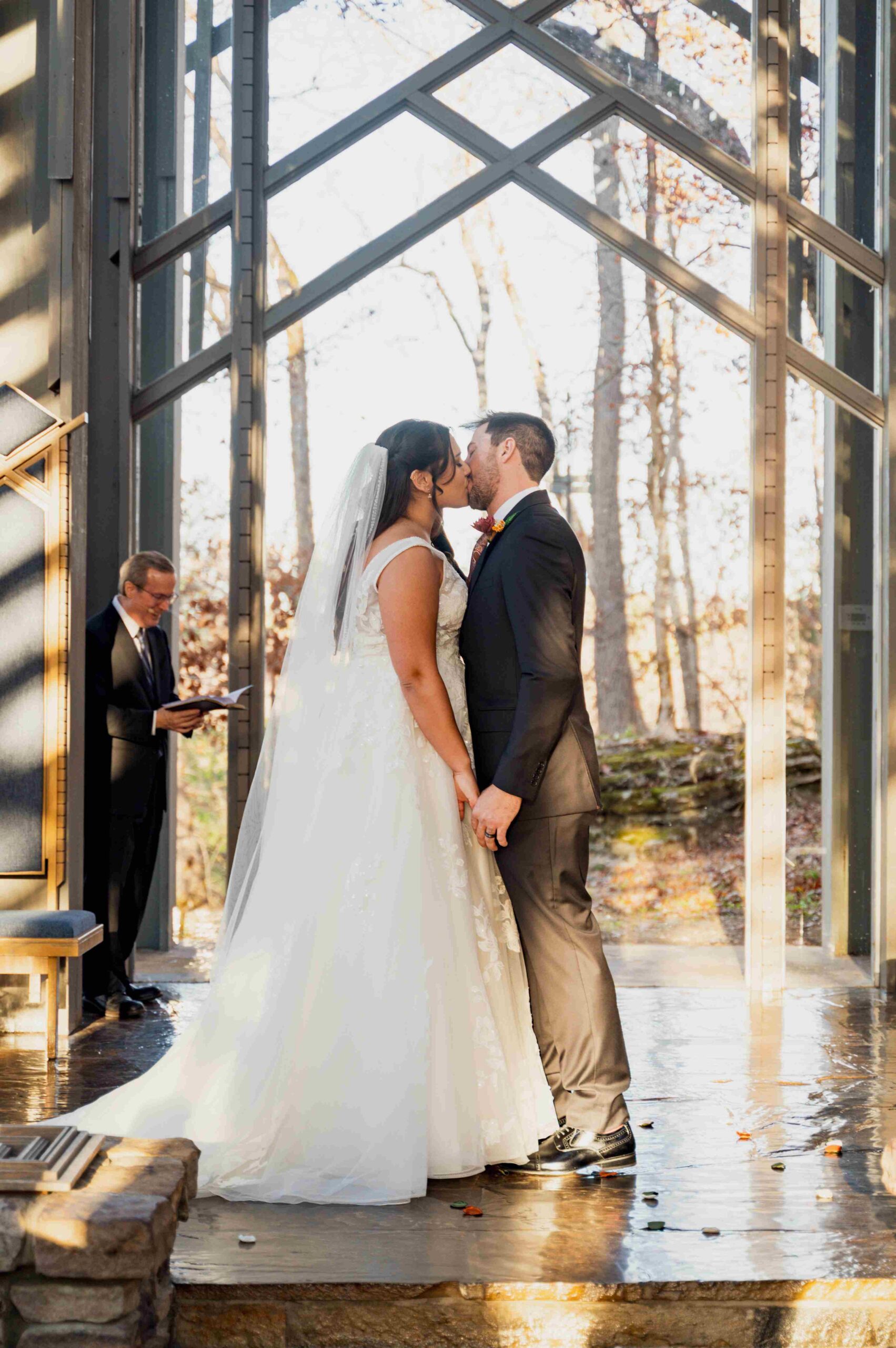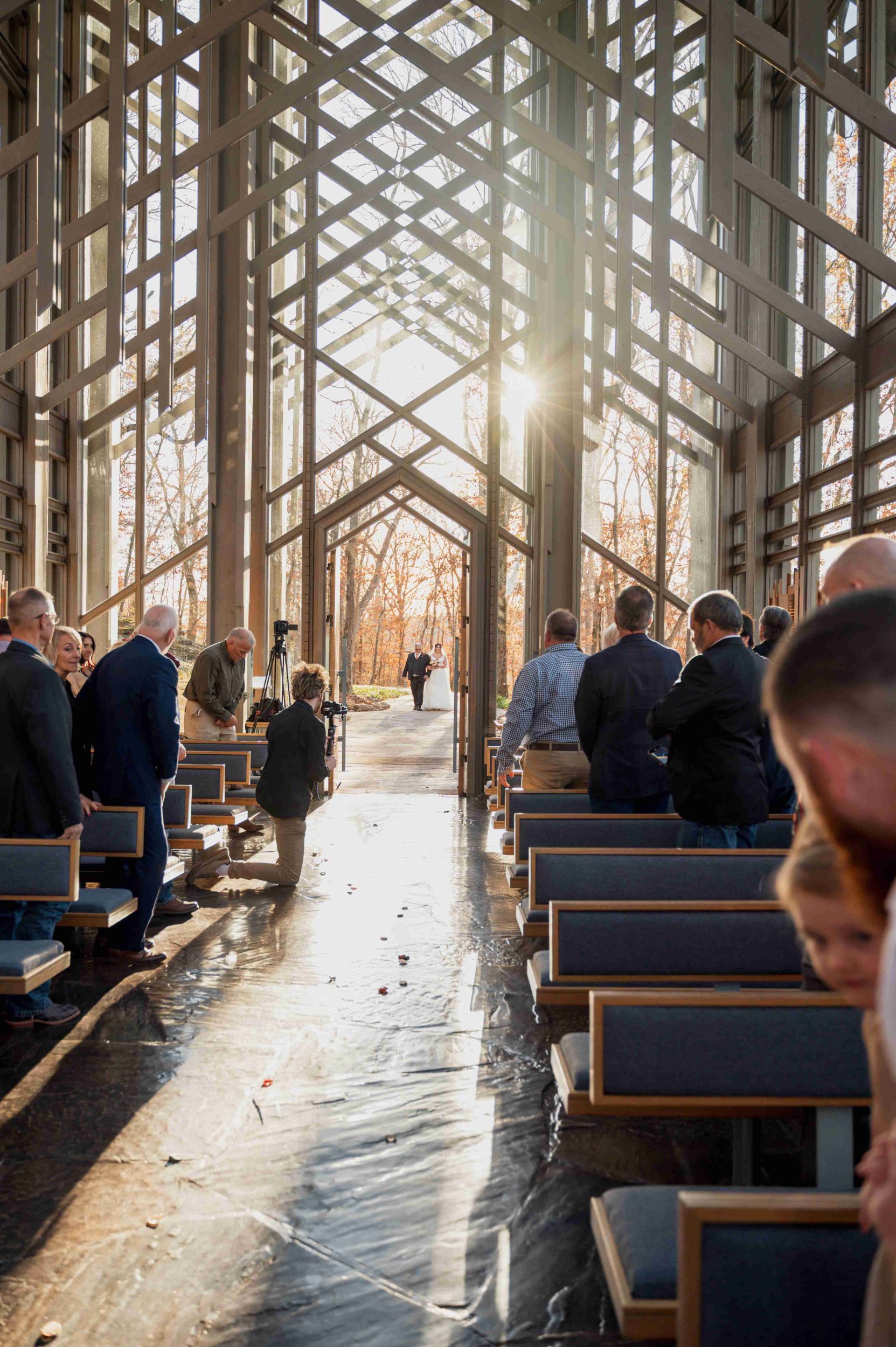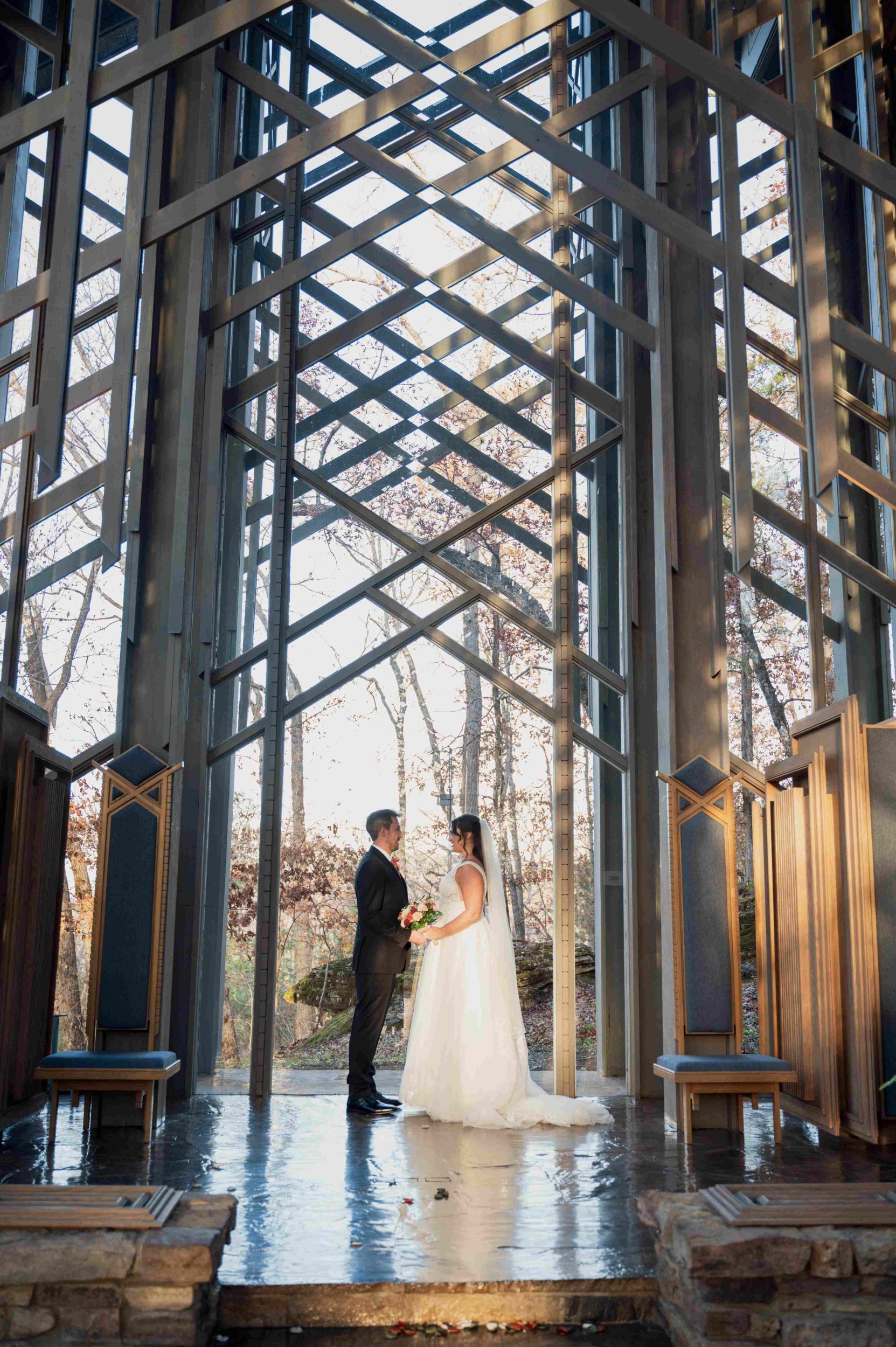 The chapel seats up to 100 guests. Our facilities also include a changing area with a full length mirror, a first class sound system, and a piano. Because of the unique acoustics of Thorncrown Chapel, listening to live or recorded music is a special experience. We can help you locate stringed quartets and other musicians to add beauty to your special day.